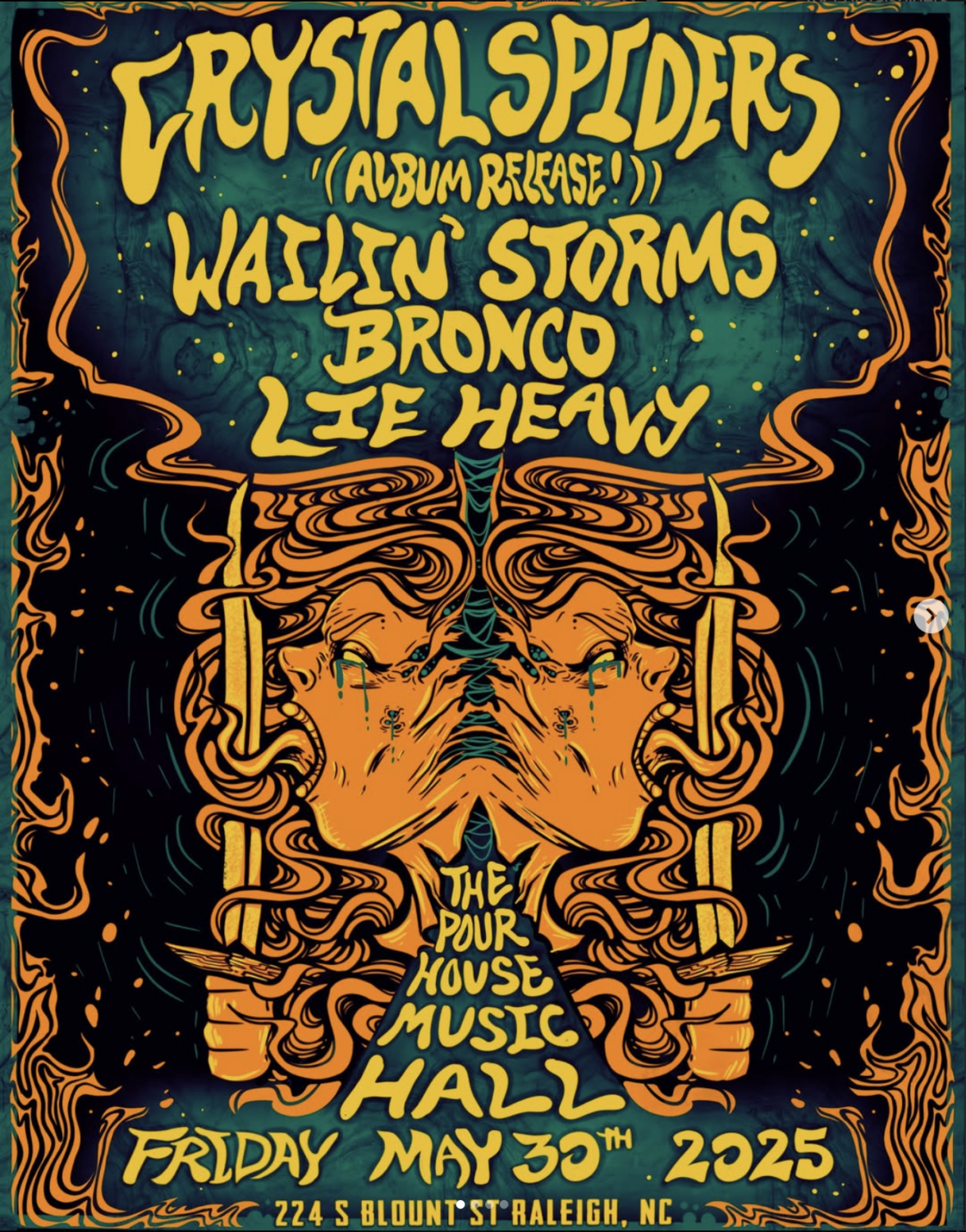 Crystal Spiders:Building on the foundations laid by legends from Black Sabbath to Windhand and beyond, Raleigh NC fuzz fanatics Crystal Spiders infuse the best elements of both classic rock and heavy metal dynamics with a hazy, psychedelic, doomed-out edge – their raw blend of powerhouse vocals, fuzzed-out bass lines, and shredding guitar that has earned them both global critical acclaim and the support of a diverse, growing fanbase over multiple singles, two full-length albums on Ripple Music, and a slew of gigs to date. An eagerly-awaited third full-length album, an appearance at Maryland Doom Fest, and an east coast tour are just a taste of what’s in store for 2025.